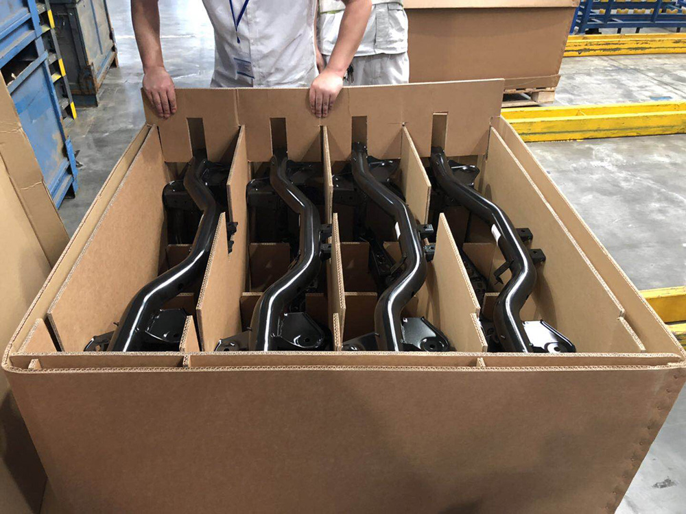 重載型五層瓦楞箱,采用AAA級(jí)牛卡紙+蜂窩加固結(jié)構(gòu),通過汽車物流TL/SL測(cè)試標(biāo)準(zhǔn)。內(nèi)置分隔襯板,可固定發(fā)動(dòng)機(jī)/變速箱等不規(guī)則部件。
